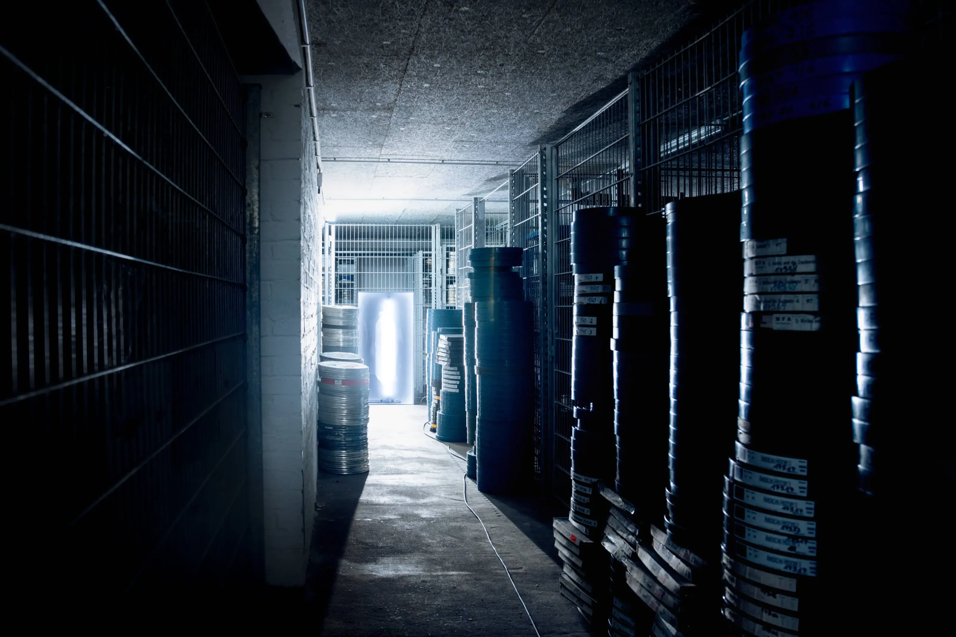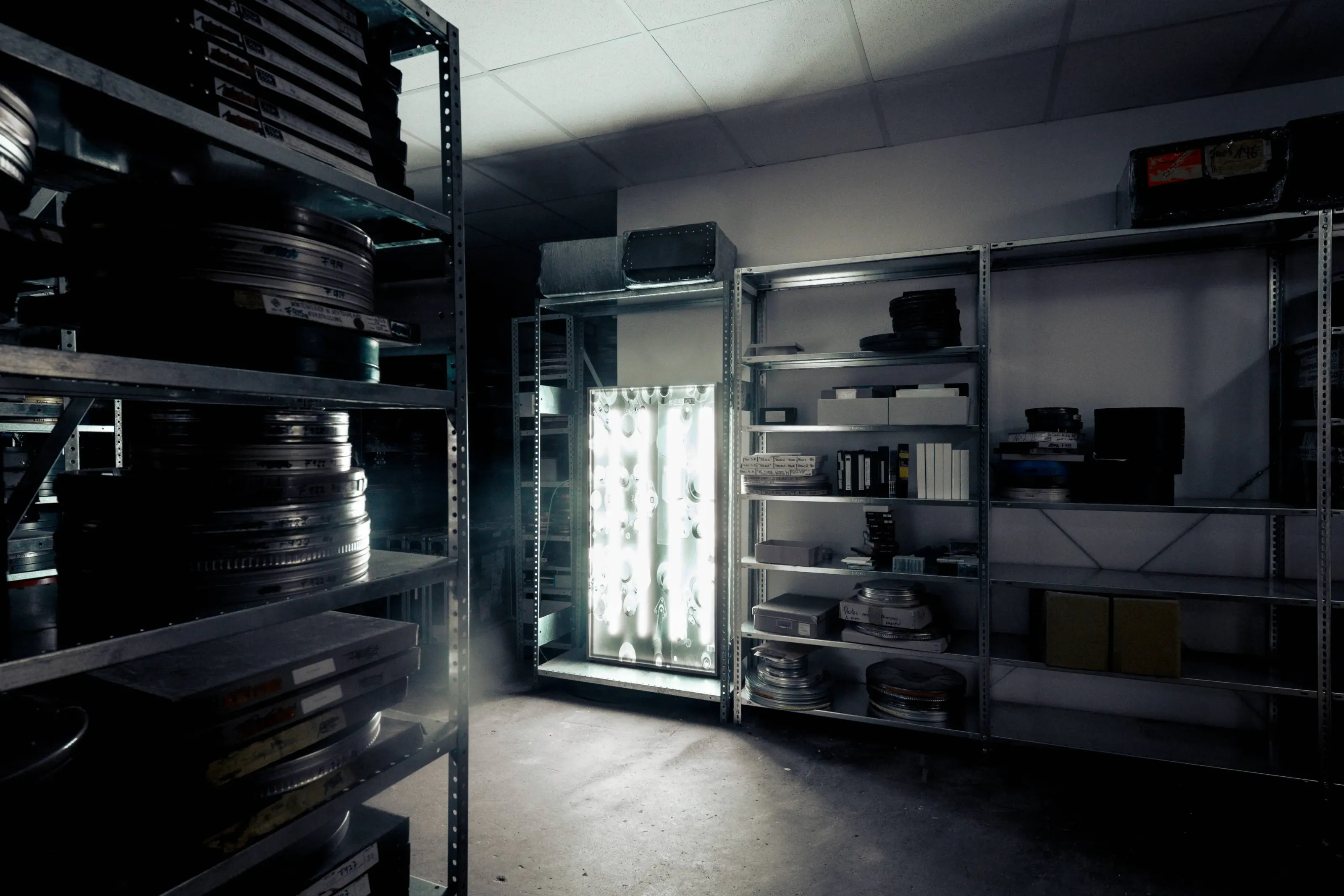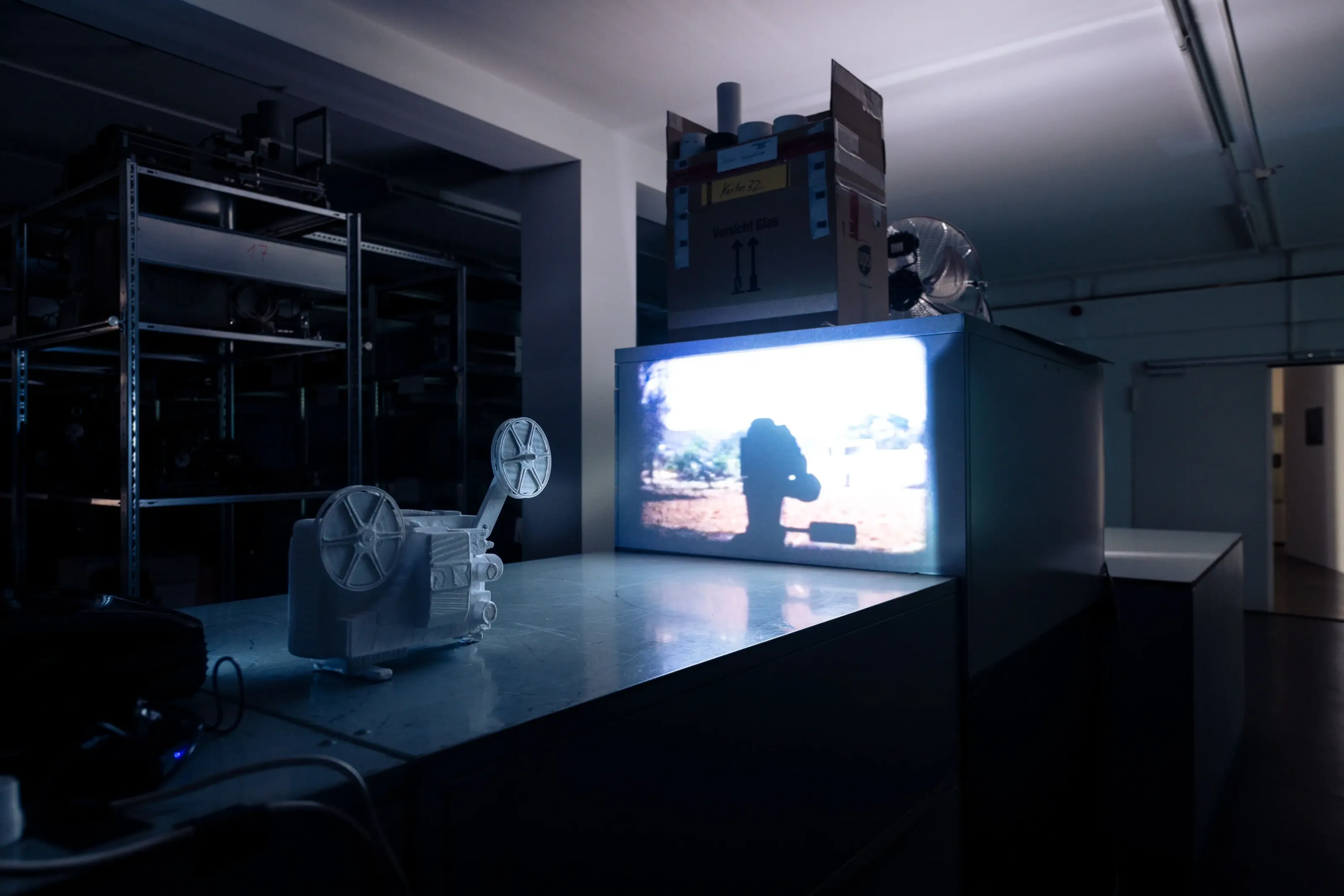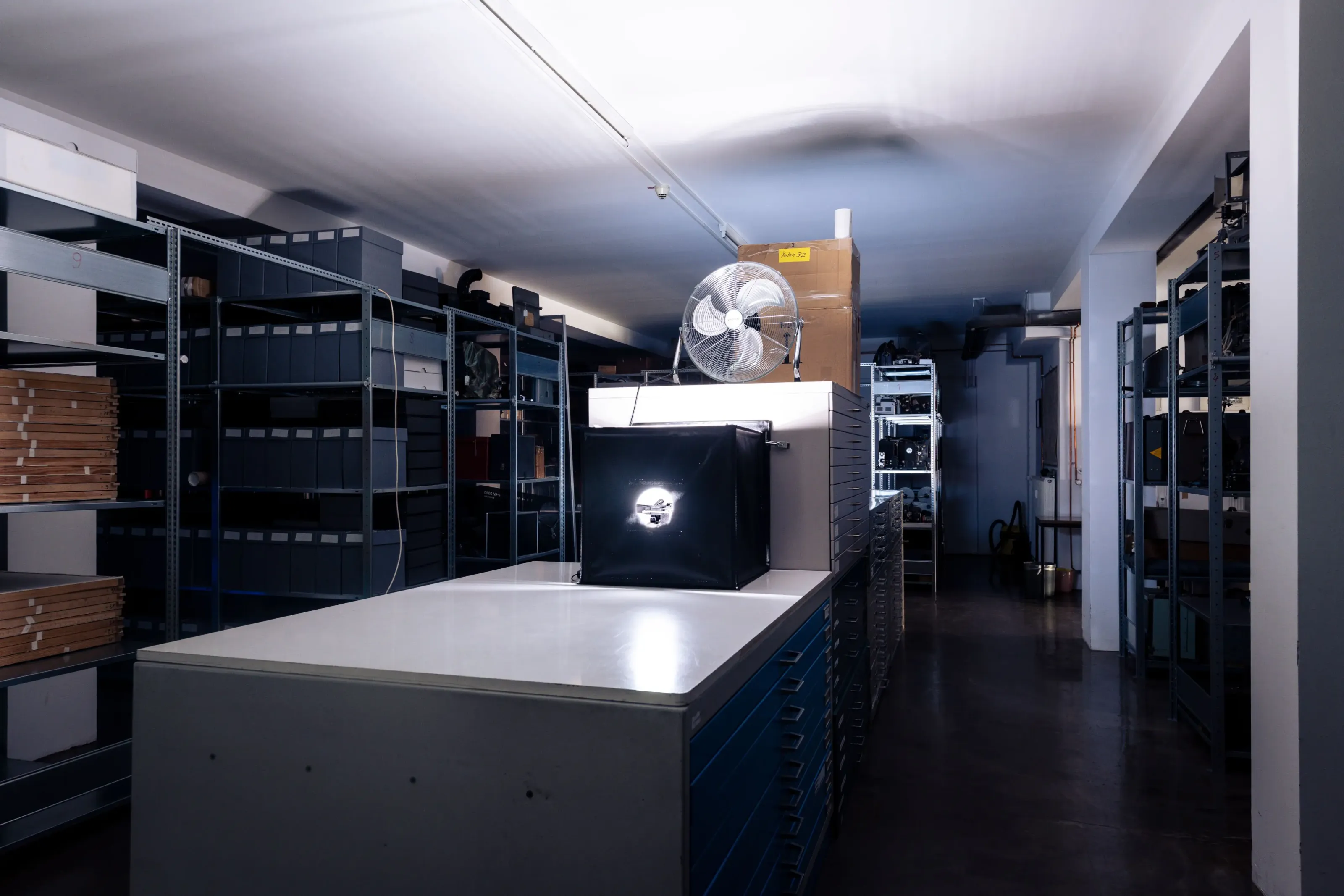Archiv // Archiv stellt eine Beziehung her, zu den nicht gezeigten Filmen und ihren Wiedergabegeräten, die im Depot einem ‚rasenden Stillstand‘ gleich – im Zustand der scheinbaren Ruhe unterkühlt und gestapelt, in Regalen geordnet, die Welt aus den Angeln heben könnte –, wenn eben diese Apparate wieder Licht projizieren und die Diaphane bei der Durchleuchtung Schatten auf unsere Retina werfen könnten …