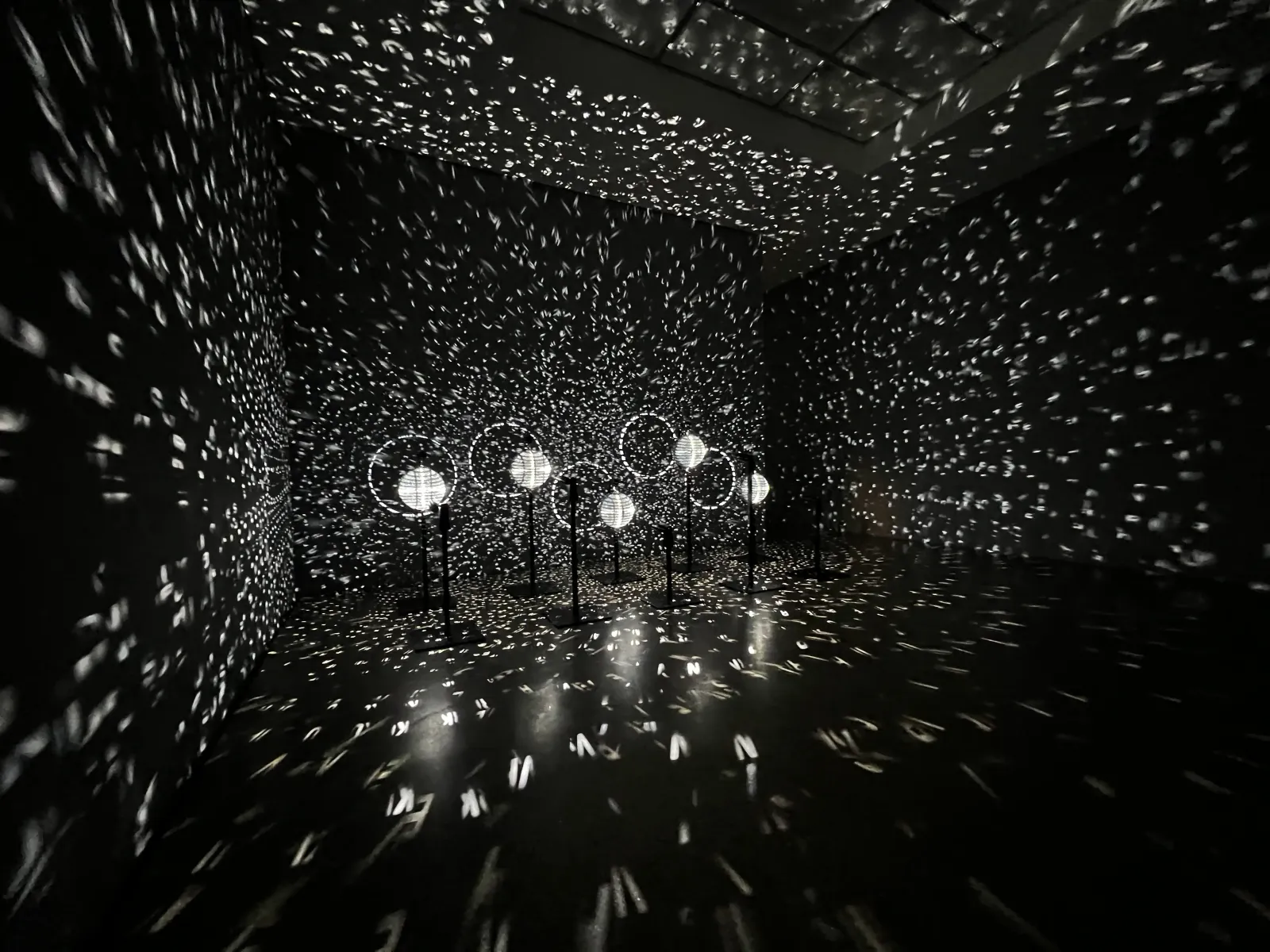 In five planets (2016) projiziert Mischa Kuball die Namen der fünf Planeten Jupiter, Mars, Merkur, Saturn und Venus auf rotierende Discokugeln. Die reflektierten Lichtstrahlen wandern unaufhörlich über die Wände und erschließen den Raum erst bei genauer Betrachtung. Sprache, Licht und Architektur verbinden sich zu einer vielschichtigen Wahrnehmungserfahrung, in der Assoziationen von Tanz, Musik und Trance ebenso anklingen wie Momente der Irritation. Durch die sich vervielfachenden Spiegelungen verweist five planets zugleich auf die Unendlichkeit und das schwer Fassbare des Universums.