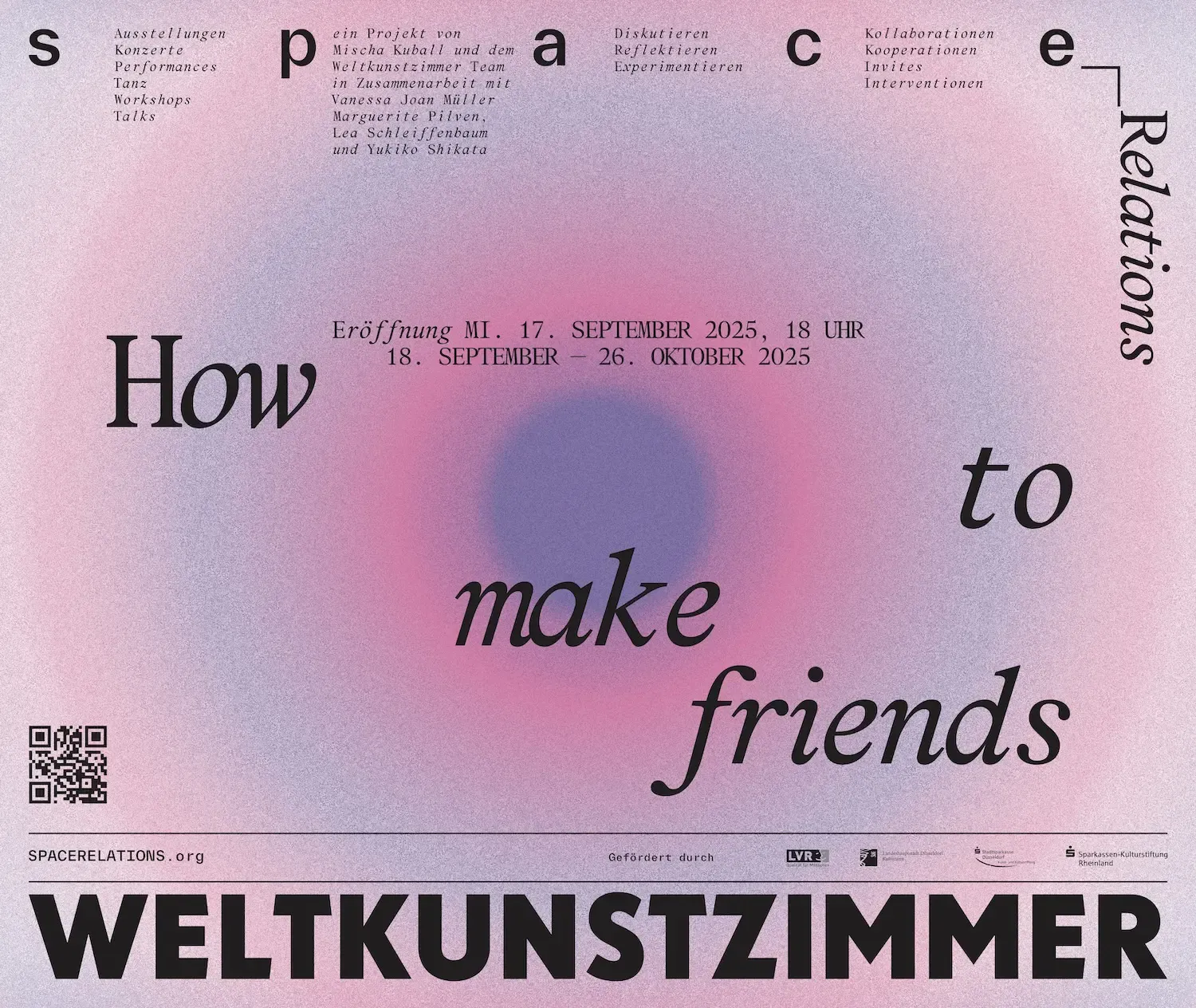 Das Weltkunstzimmer Düsseldorf schließt in Zusammenarbeit mit dem Künstler Mischa Kuball sein einjähriges Projekt space_relations mit der Abschlusspräsentation How to make friends ab. Im Laufe des Jahres 2025 entwickelte sich das Projekt zu einem offenen Laboratorium, in dem mehr als 30 Künstler, Theoretiker und Kulturschaffende aus verschiedenen Disziplinen zusammenkamen, um Modelle von Kollaboration, Communities auf Zeit und gemeinsamer Autorenschaft zu erproben.