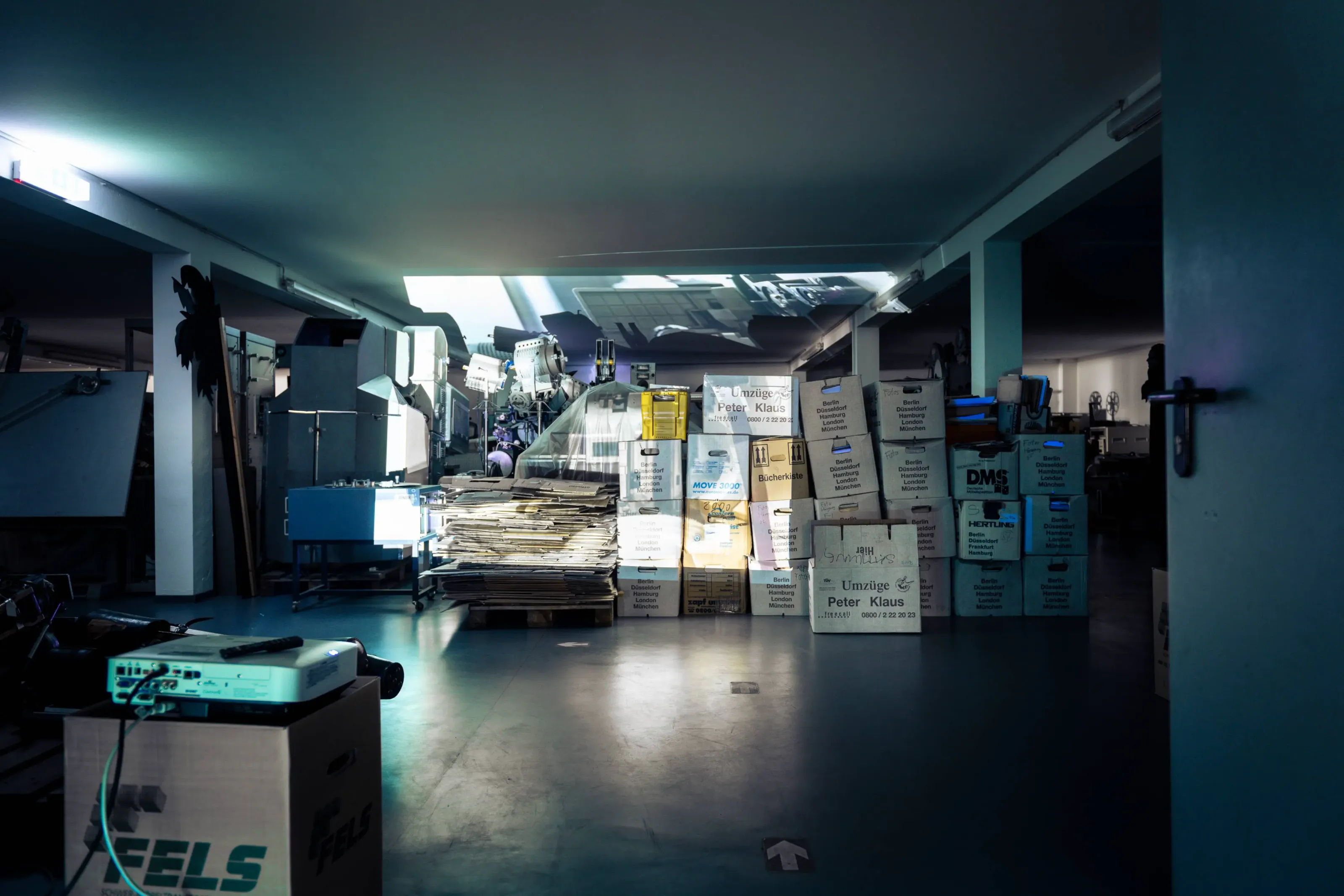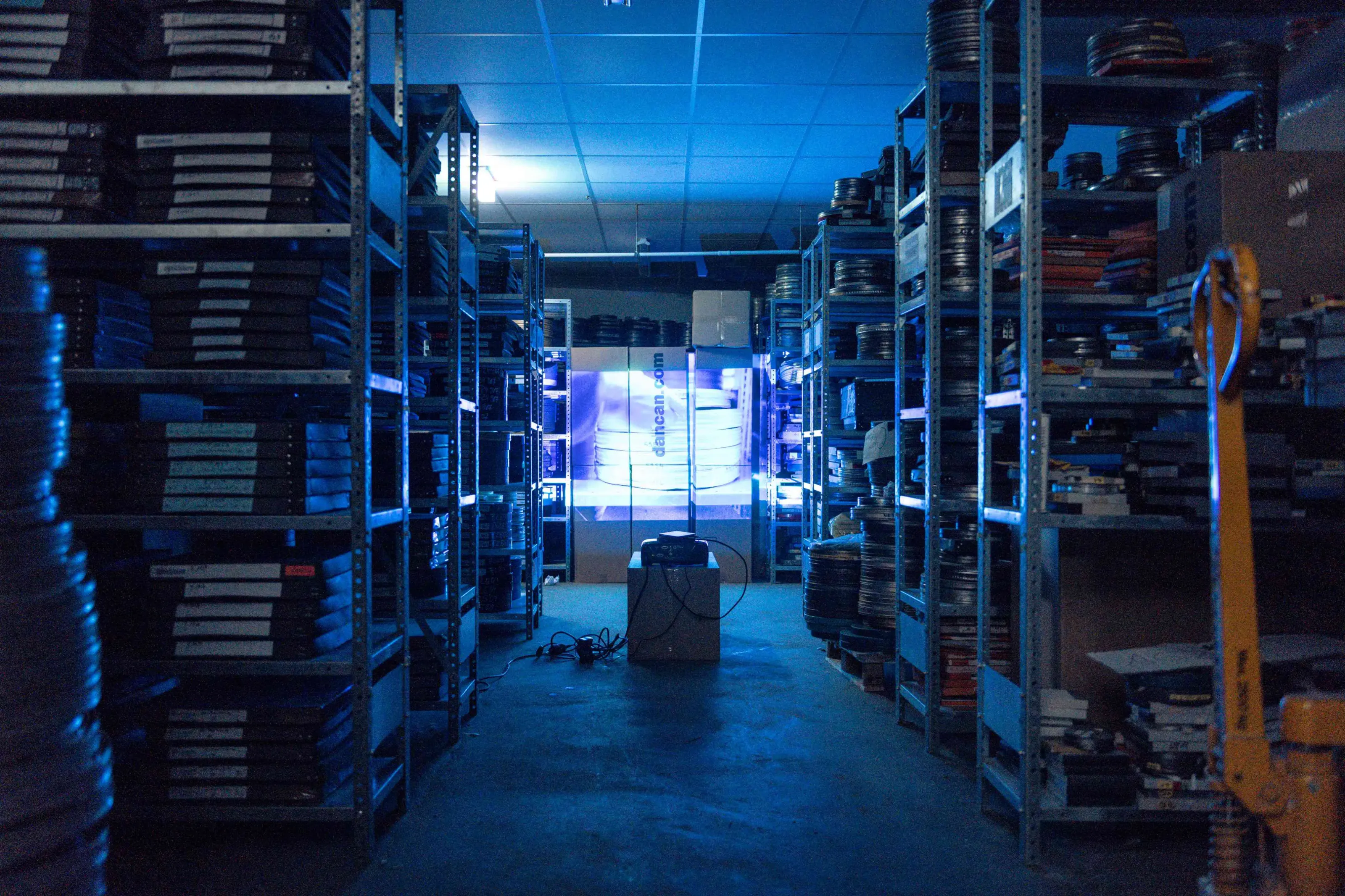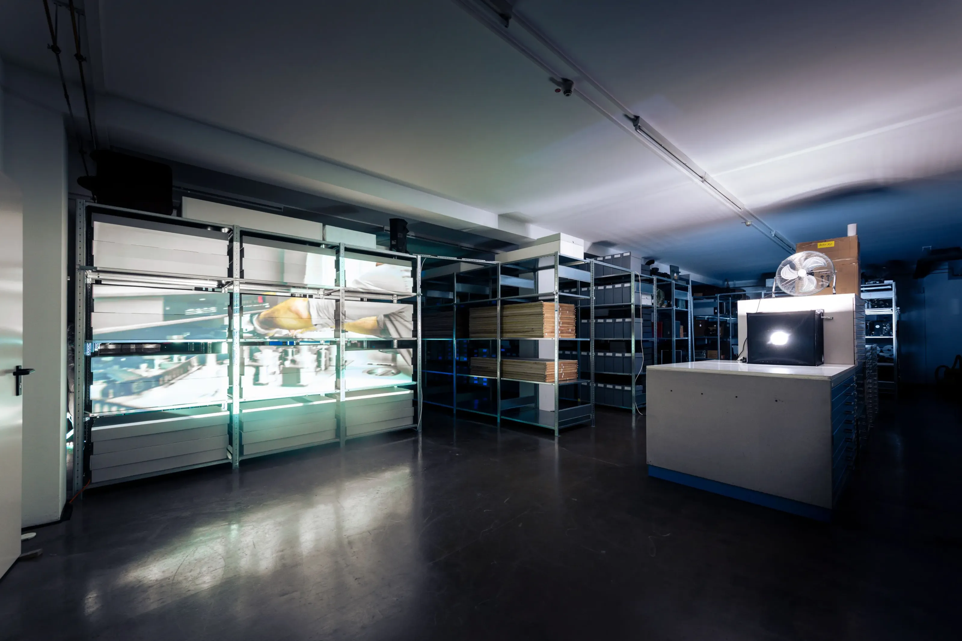 Archiv // Archiv stellt eine Beziehung her, zu den nicht gezeigten Filmen und ihren Wiedergabegeräten, die im Depot einem ‚rasenden Stillstand‘ gleich – im Zustand der scheinbaren Ruhe unterkühlt und gestapelt, in Regalen geordnet, die Welt aus den Angeln heben könnte –, wenn eben diese Apparate wieder Licht projizieren und die Diaphane bei der Durchleuchtung Schatten auf unsere Retina werfen könnten …